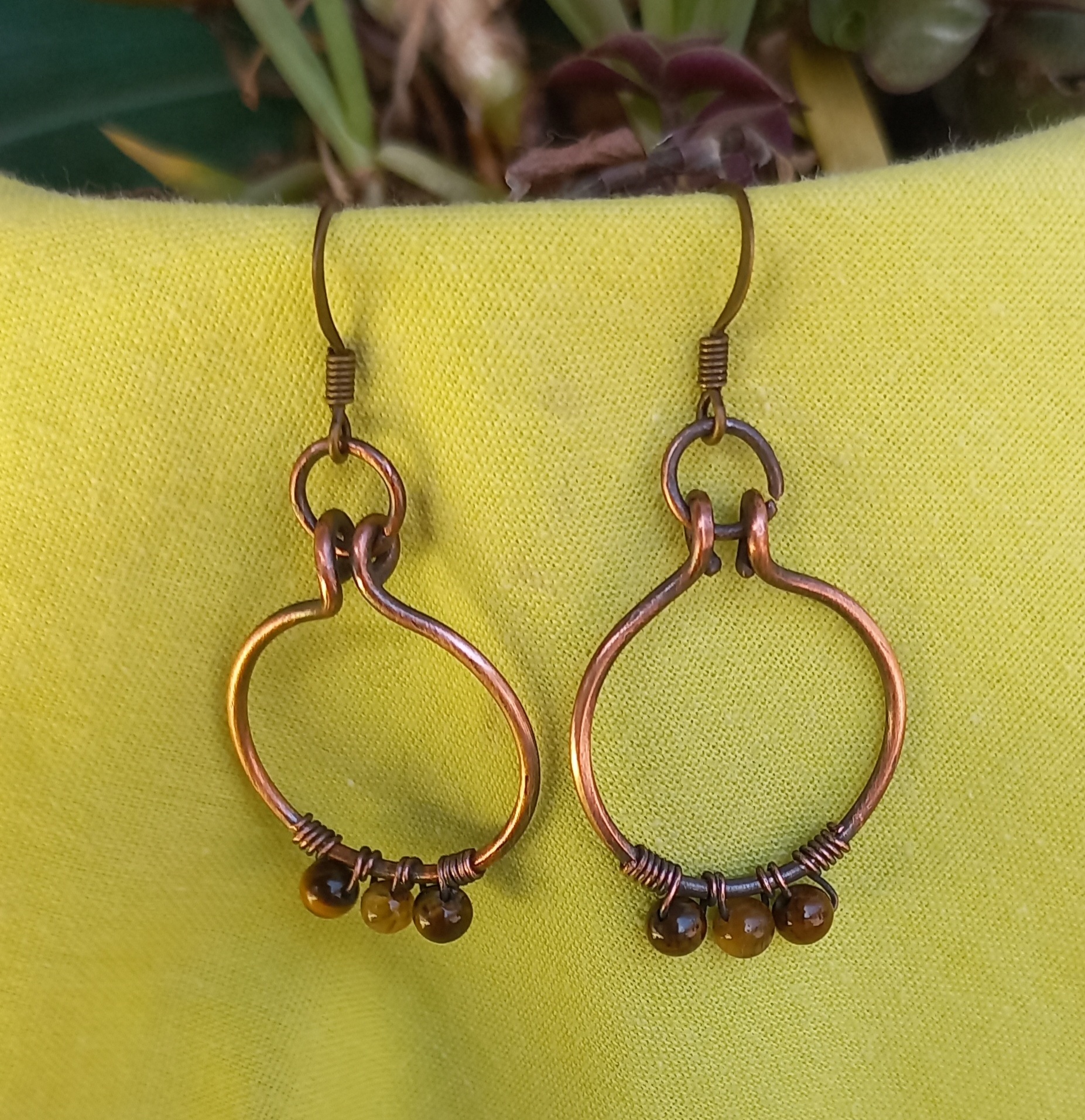 Gypsey Creations copper ear rings for pierced ears. Accessorise your ears with a warm earth feeling pair of Copper Tigers eye bead ear rings.