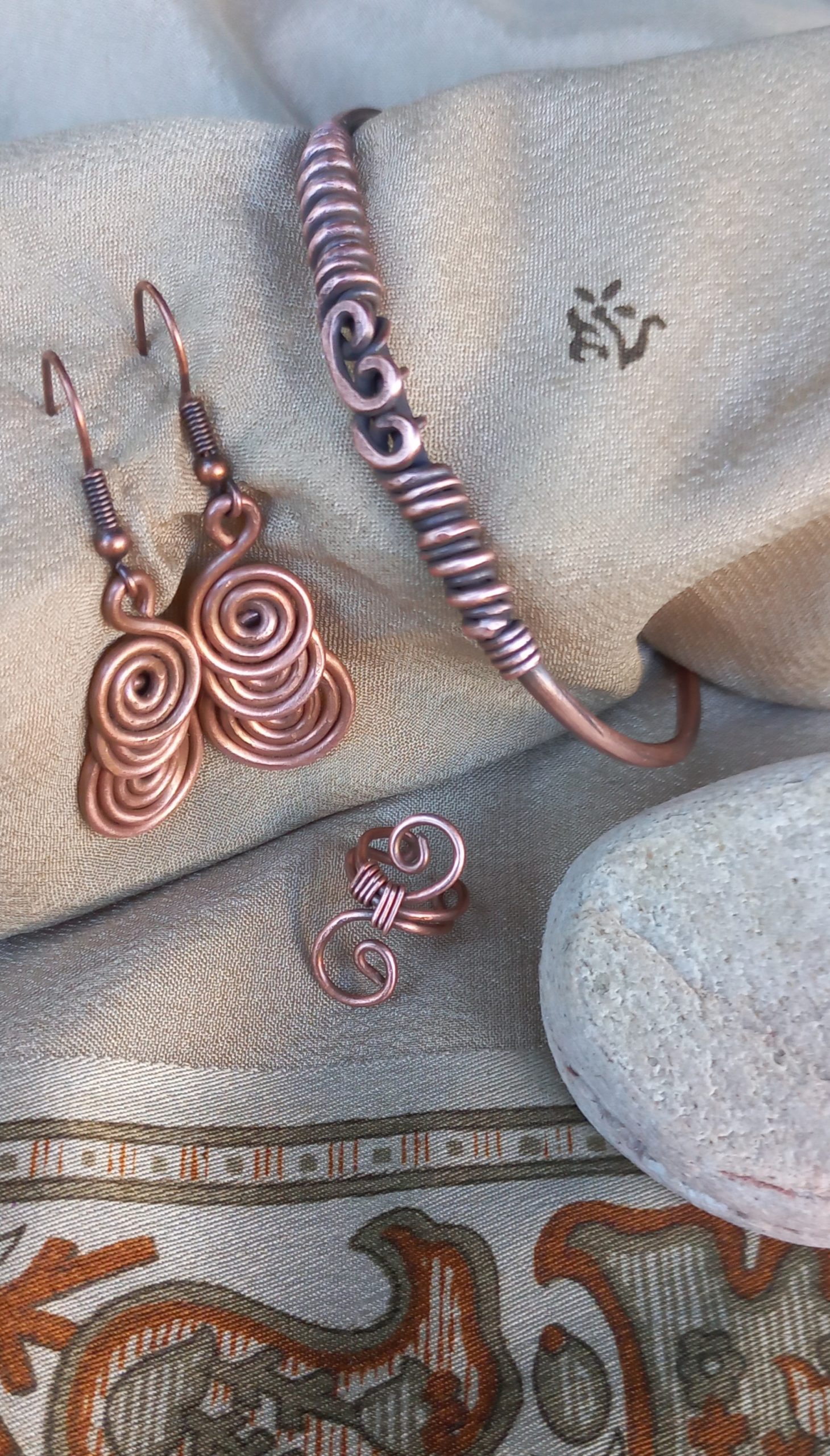 Indulge in the exquisite world of a unique one of a kind handcrafted bracelet, with a pair of copper ear rings and a copper ear cuff to compliment your copper ear ring.
